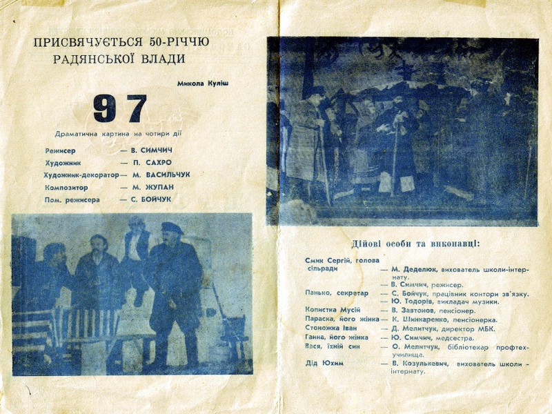 Василь Симчич ставить виставу “97” Миколи Куліша. У виставі режисер зайняв кращих своїх акторів: Мусія Копистку зіграв пенсіонер Василь Завтонов, Гната Гирю - Іван Рогужинський, його доньку Лизю - працівник палацу піонерів Богдана Демків, Панька - викладач музики Юрко Тодорів, голову сільради Сергія Смика зіграв сам Василь Симчич. Хоча свою прем’єру театр присвятив 50-річчю Радянської влади, сценічні епізоди правдиво відображали суперечливу і драматичну картину становлення влади робітників і найбіднішого селянства. |